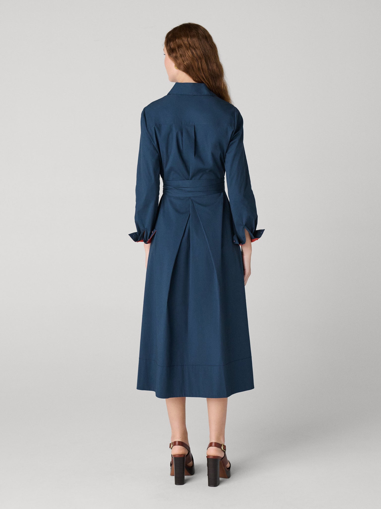 Our Eve Dress is a tailored wrap silhouette cut from our crisp cotton fabric, finished with a bold pop of red at the cuffs and collar.