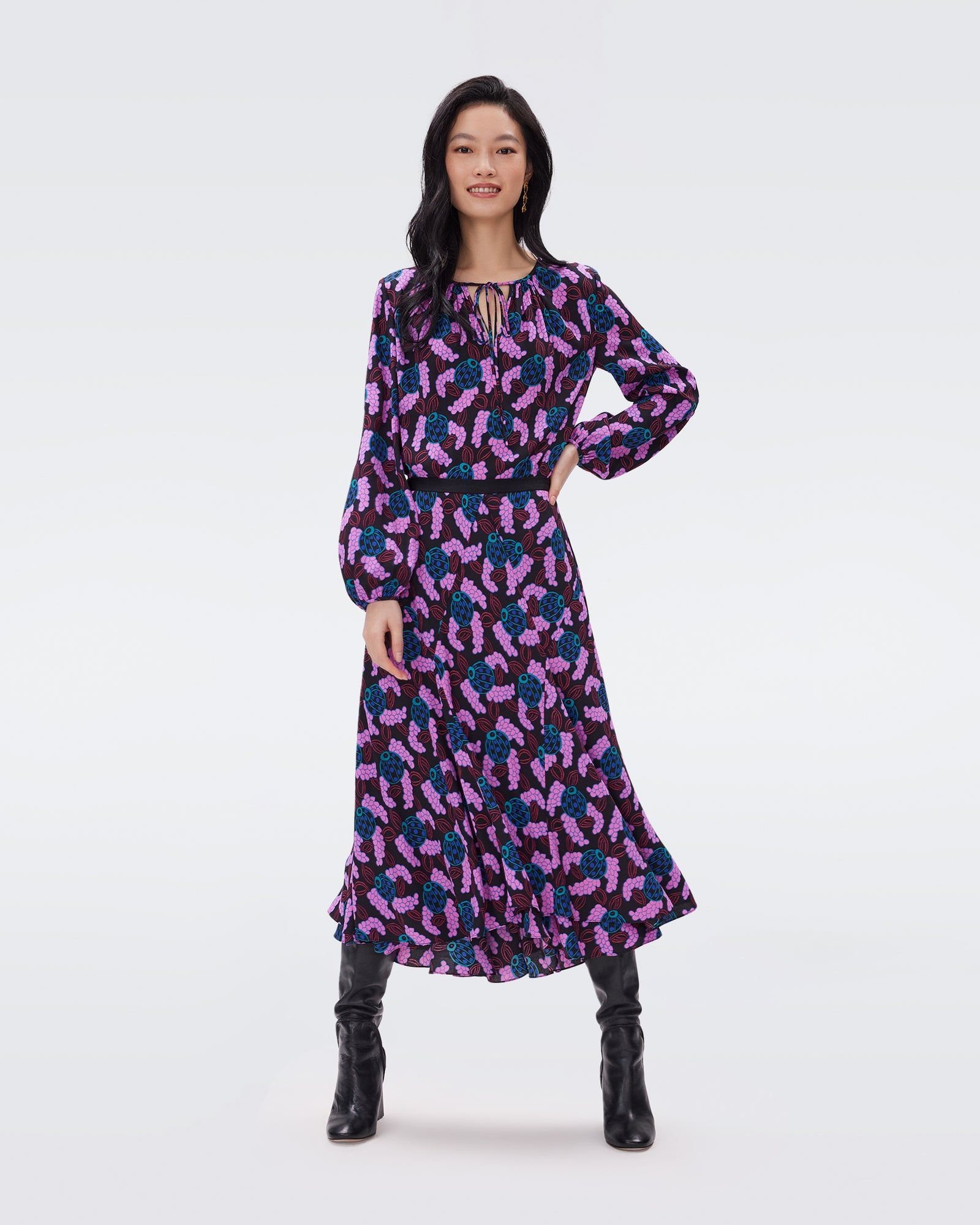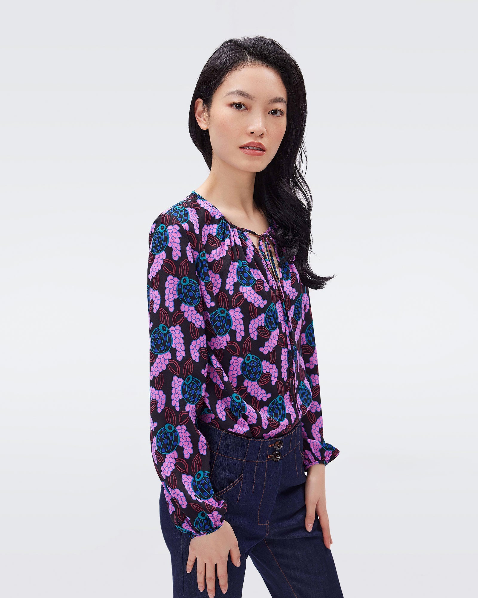 Our take on the peasant blouse, the Freddie is cut from a lightweight crepe. This piece has a relaxed, easy shape, long billowy sleeves, and neck tie detail.
