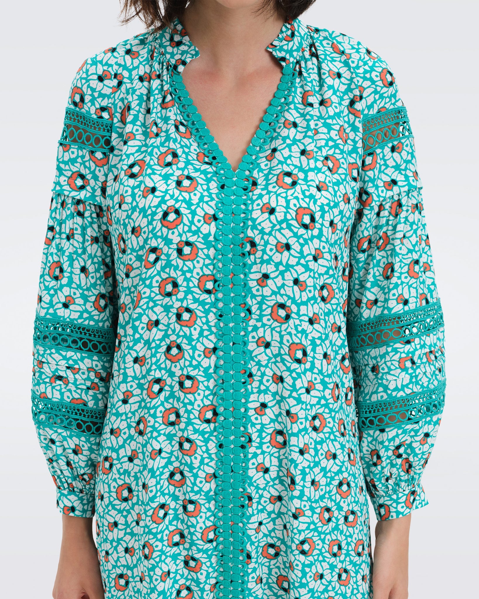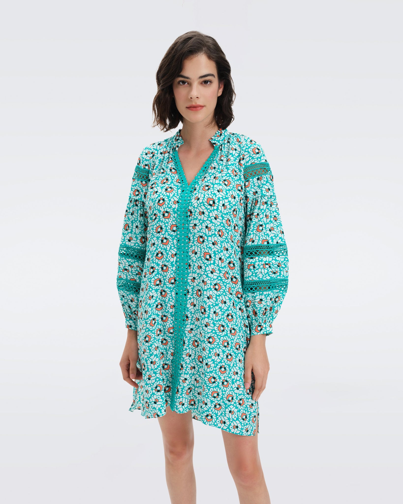 Made from soft crepe, the Jessica mini dress is cut for a loose fit with balloon sleeves. It has a V-neckline, a short collar, and decorative buttons. A boxy silhouette and small slits on each side of its skirt make movement easy.