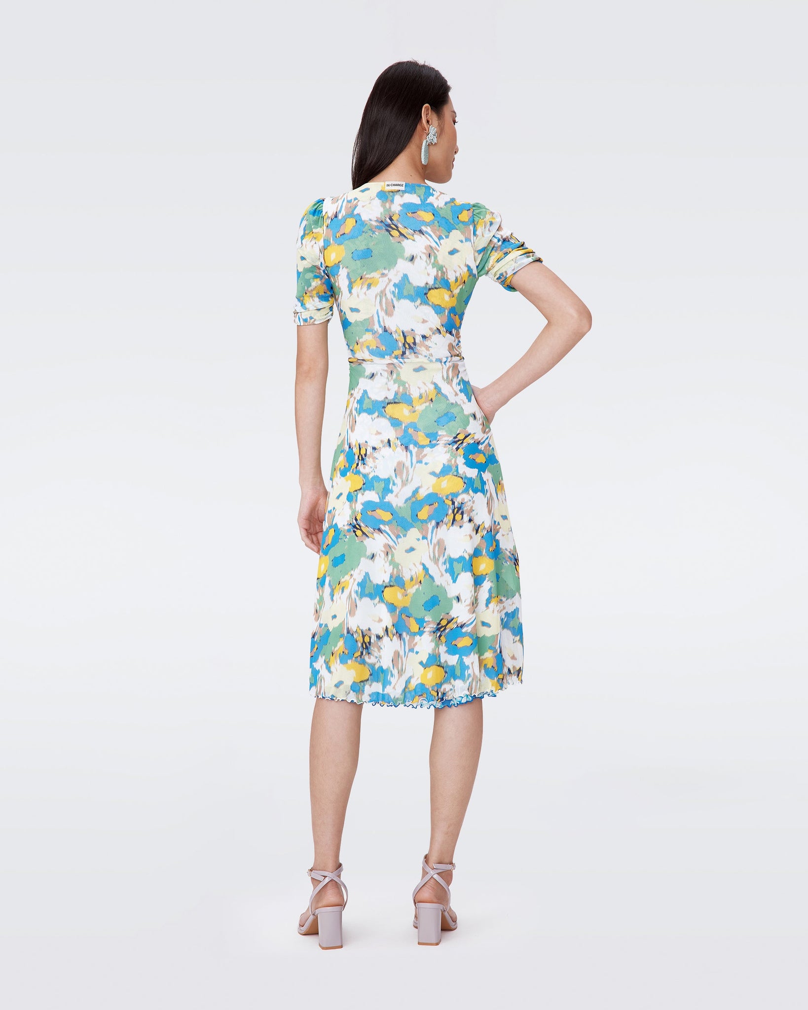The Fortina is a loose-fitting midi dress cut from a soft silk blend. It has a V-neckline with small ruffle detail on its collar, where a drawstring can be tied to create a high neckline. Its long ballooning sleeves end in smocked cuffs with ruffled trim.