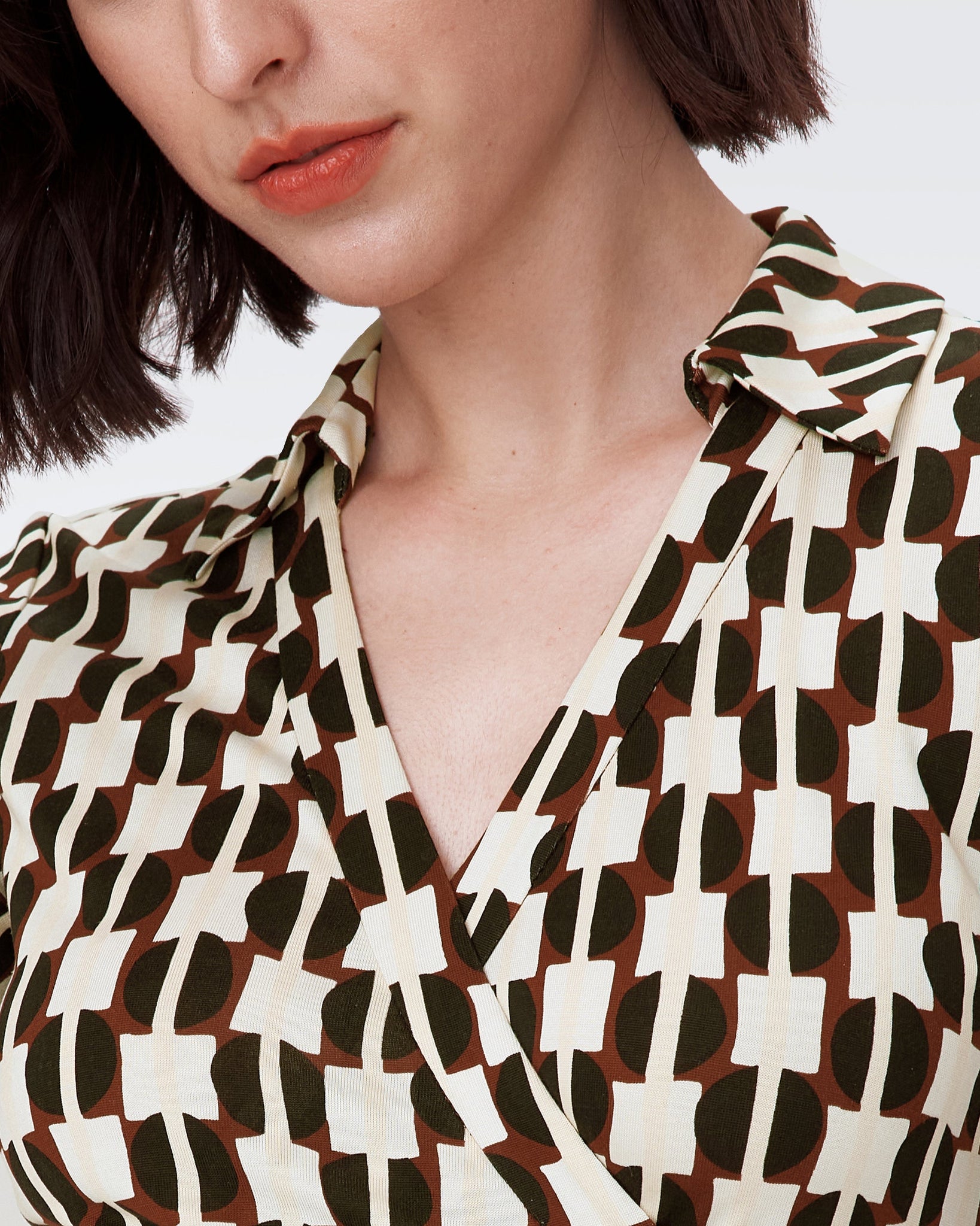 One of our most iconic silhouettes, the Jeanne is a knee-length dress with true wrap closure. Cut from our signature silk jersey, this piece has three-quarter sleeves, a V-neckline, and a classic collar.