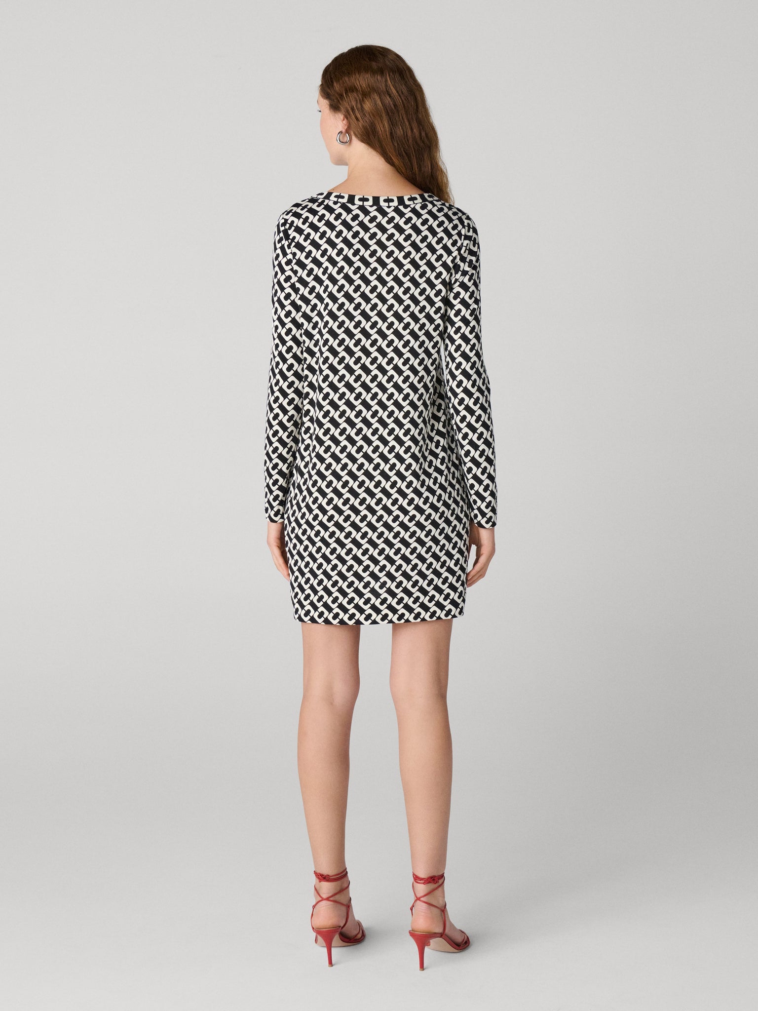 Crafted from our signature silk jersey in the iconic chain link print, the Reina Dress is a playful shift mini designed for effortless style.