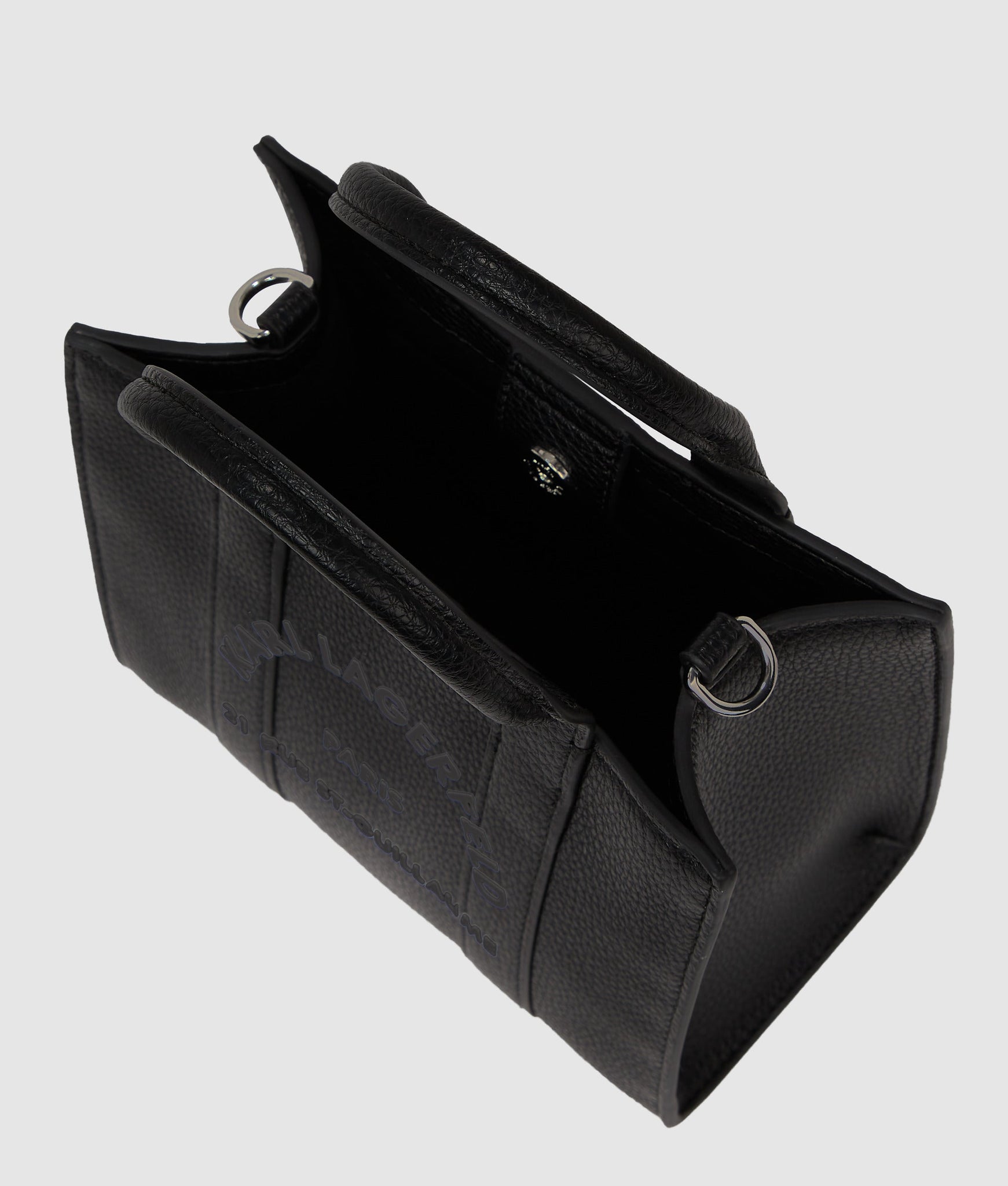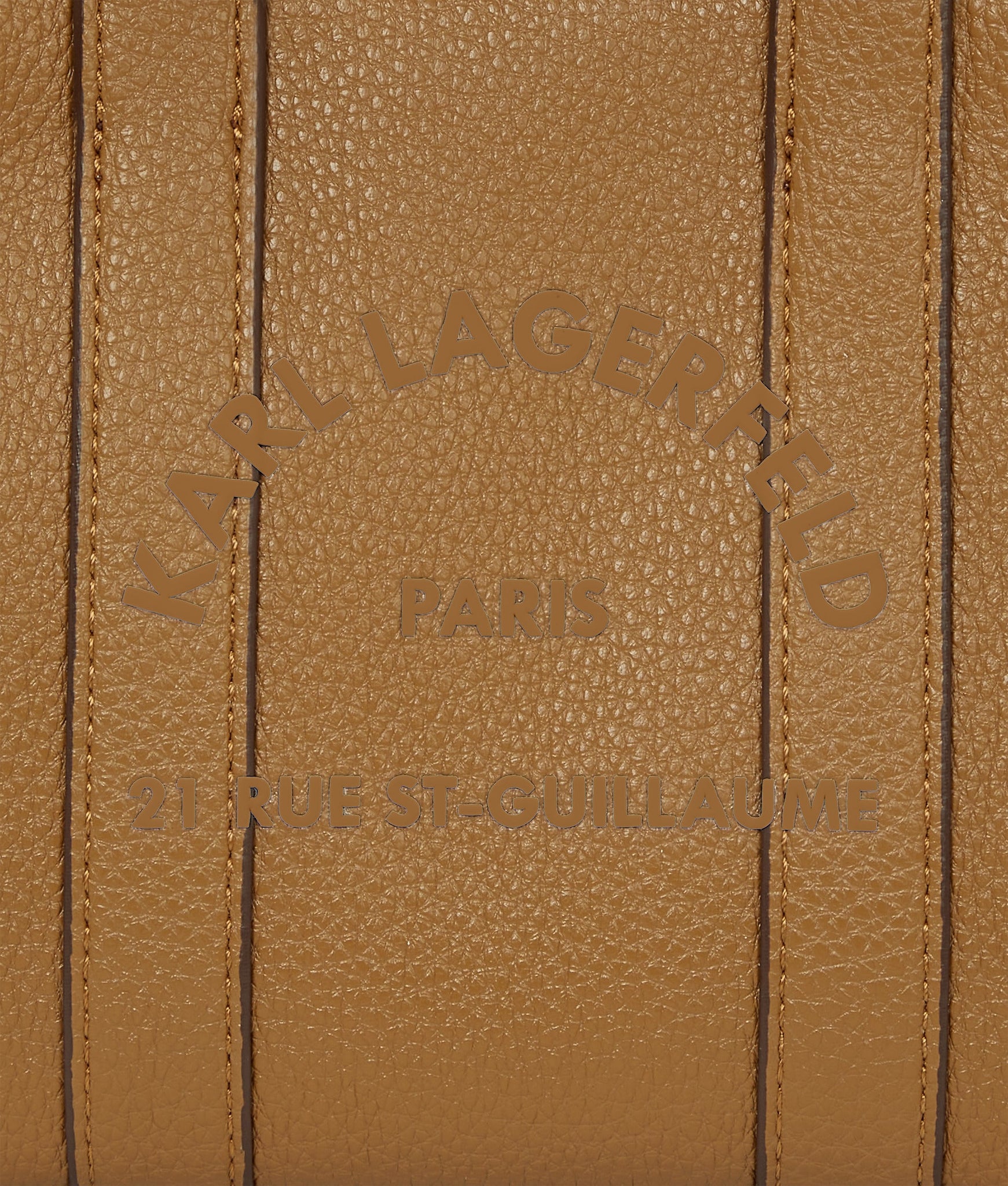 This mini tote bag offers a contemporary square silhouette with a secure metal pin closure. Twin handles and a detachable crossbody strap offer personalized styling, while the Rue St-Guillaume logo adds a touch of sophistication.
