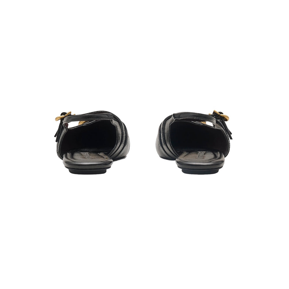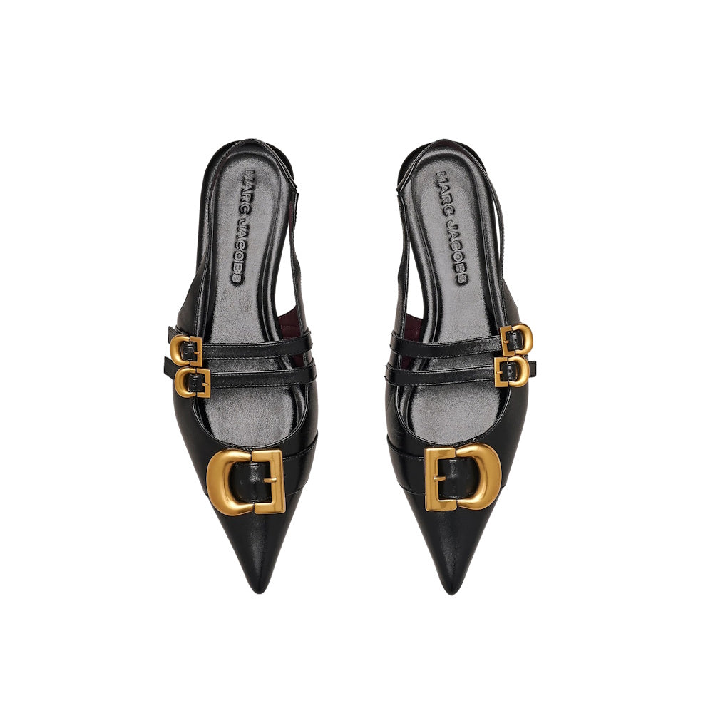 Classic sophistication meets contemporary design with this covetable pointed-toe slingback. Inspired by the doll-influenced details of the Fall ’24 Runway, this slip-on silhouette crafted in sleek, smooth leather features decorative double-straps with metal hardware closures and a prominent gold buckle closure, calling back to the exaggerated proportions of Marc’s doll-inspired runway collection.
