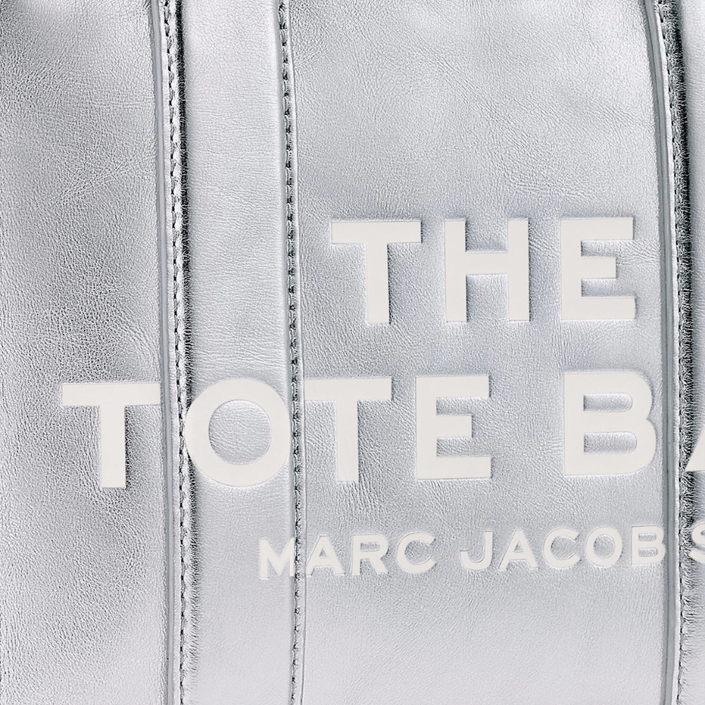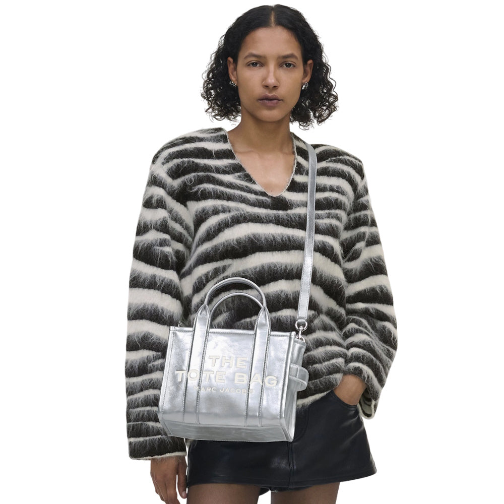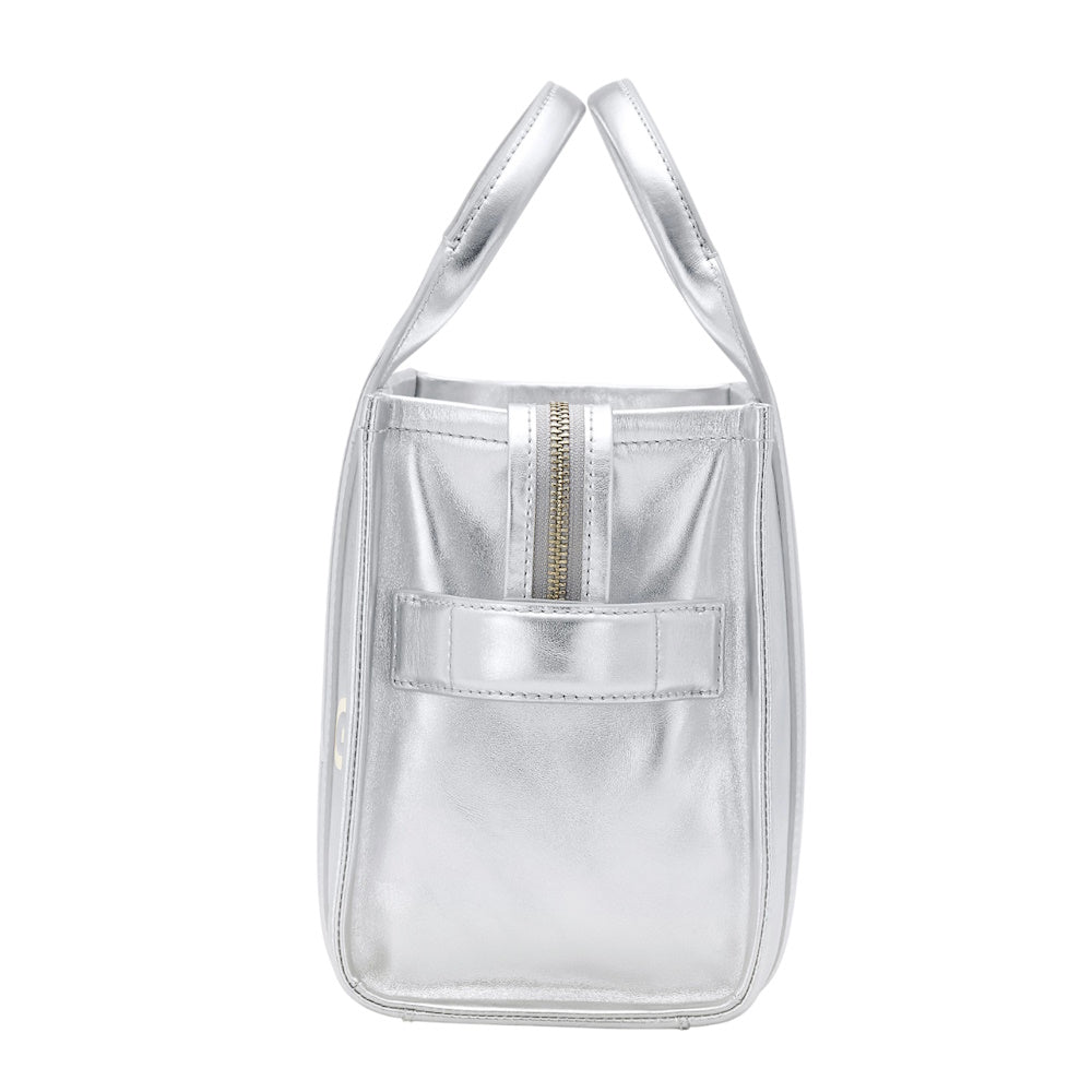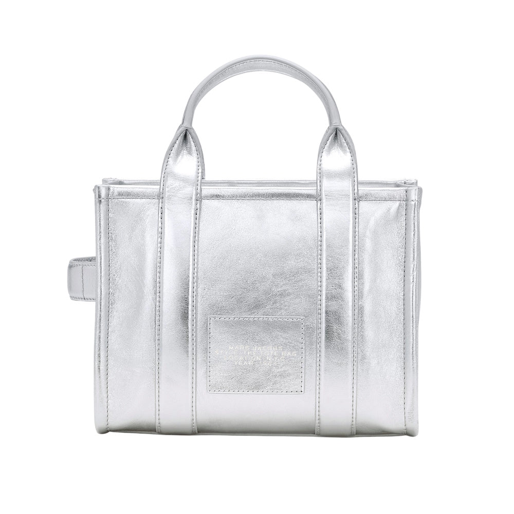 This version of our Small Tote is crafted in striking silver leather. A chunky top zip closure, one slip pocket, one card slot and the namesake debossed branding make the small tote a perfect compact plus one. Carry yours by the top handles or attach the adjustable, removable crossbody strap for hands-free styling. Part of THE™ collection.