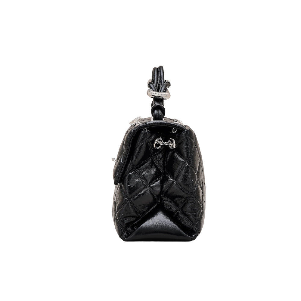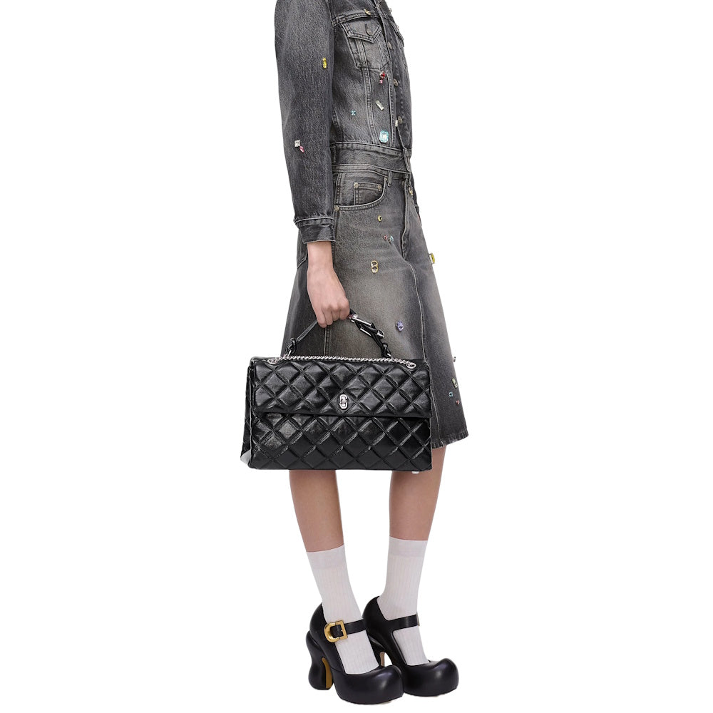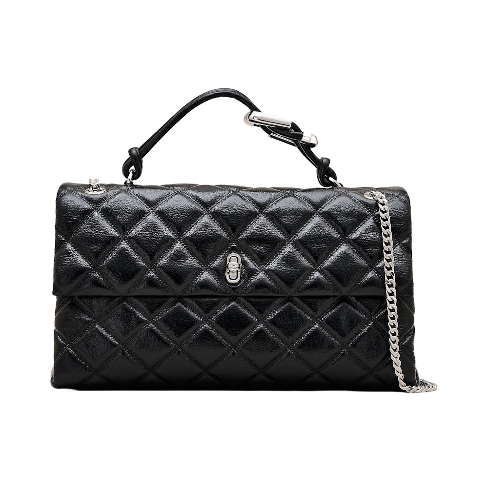 Luxuriously crafted in quilted full-grain leather for a Stam-inspired puffed texture, this instant-icon introduced on the Marc Jacobs runway features a J Marc turn-lock closure, our handle-adorning signature Dual hardware and our iconically bold Dual silhouette sized up for optimized storage. With a stitched leather top handle for hand-held styling and a pull-through chain strap for over the shoulder or crossbody styling, this true convertible essential can be effortlessly worn three ways.
