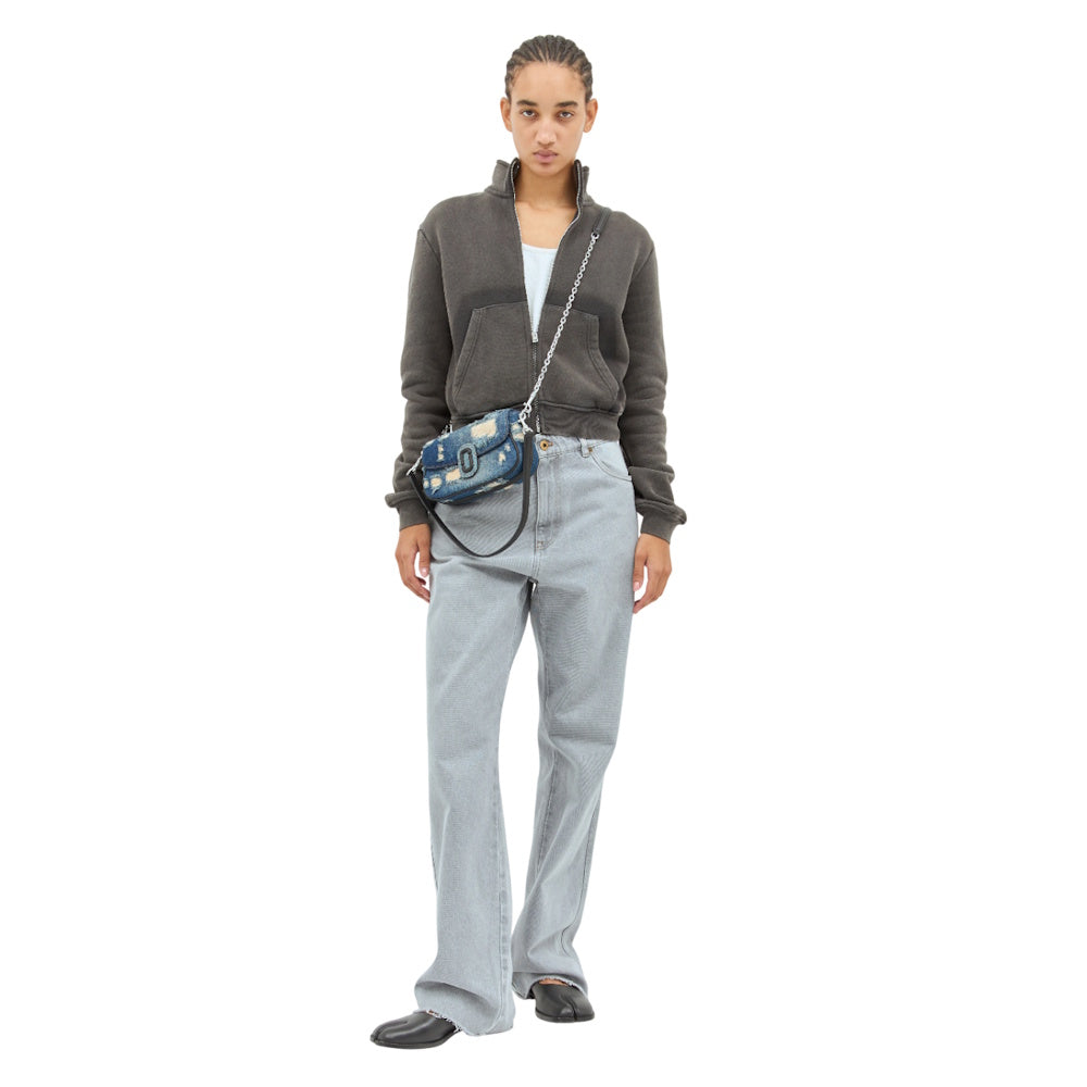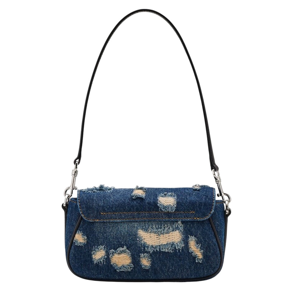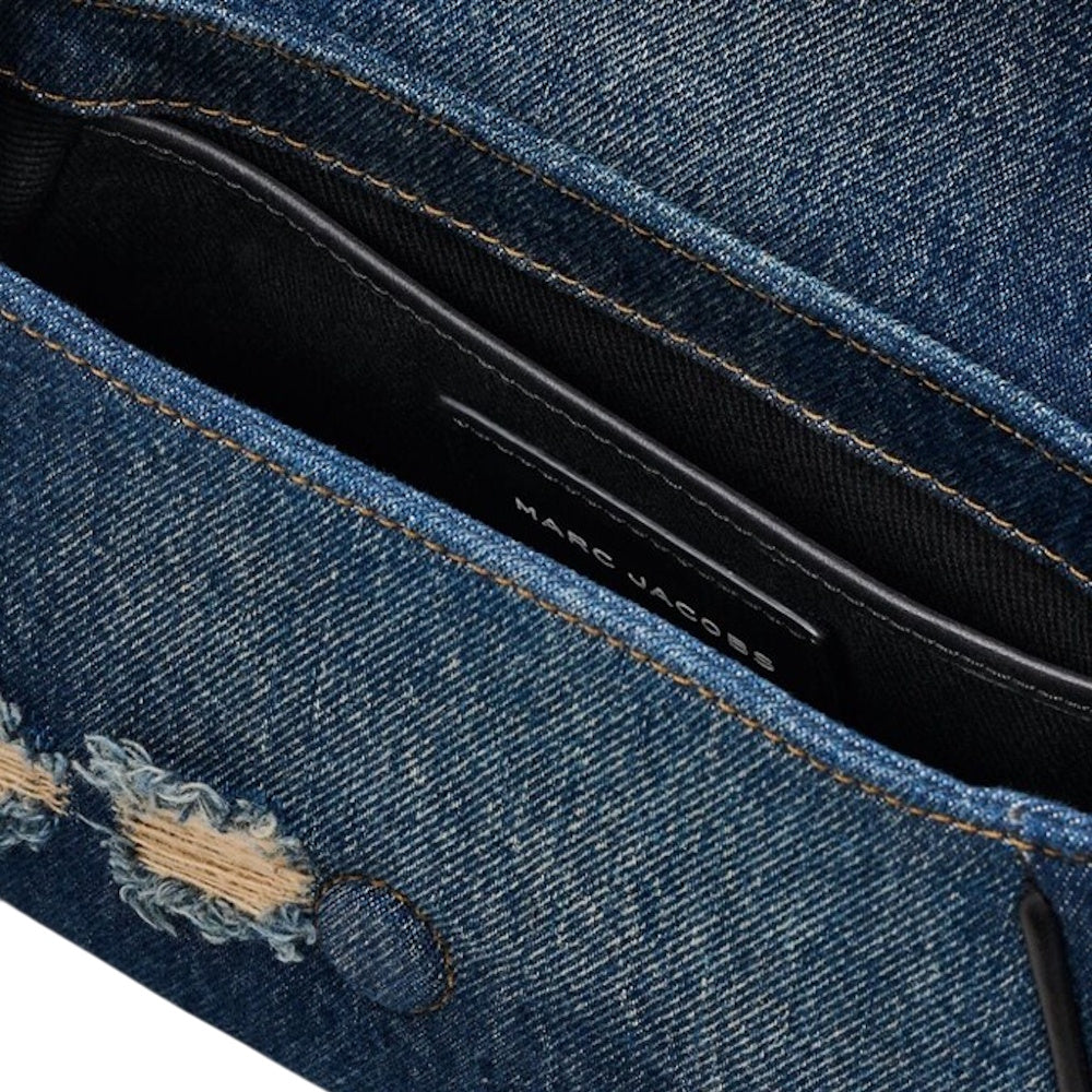 The Marc Jacobs The Rip and Repair Denim Clover Shoulder Bag is crafted in distressed denim featuring an effortless magnetic closure and signature covered J Marc seal. The bag features ornamental piping and rounded accents inspired by the plush layering of overlapping leaves. This shoulder bag includes a removable leather shoulder strap that doubles as a wristlet, and a crossbody chain strap. The bag can be carried as a clutch, on the shoulder, or crossbody.