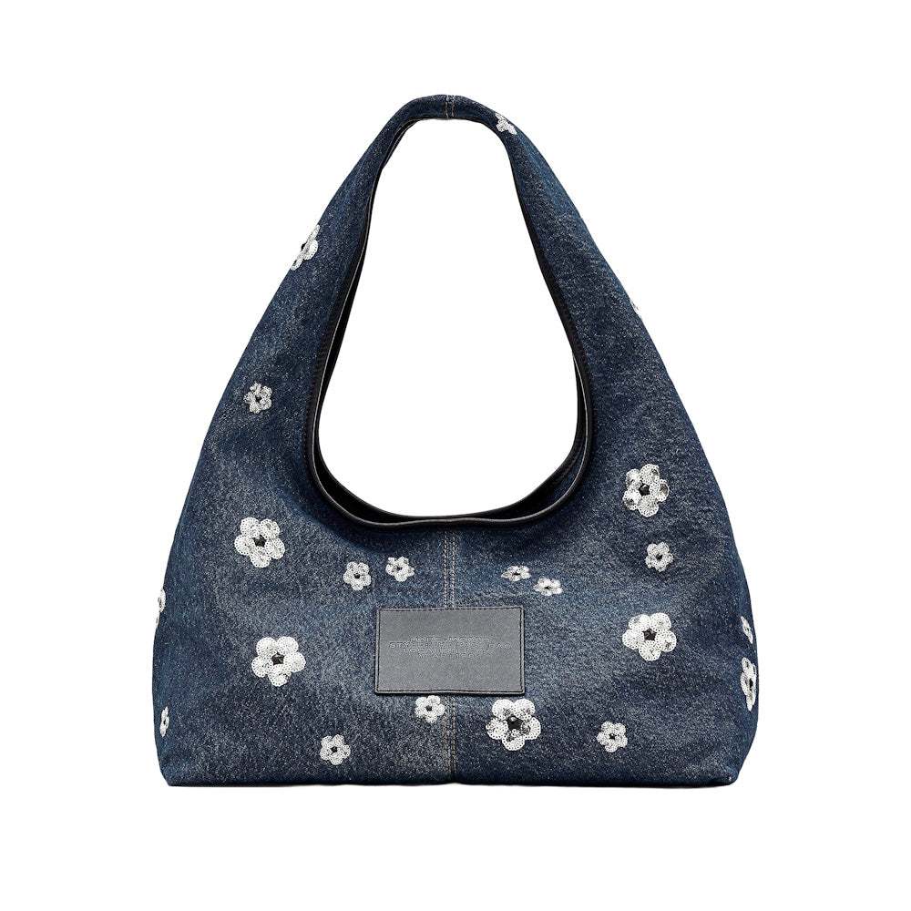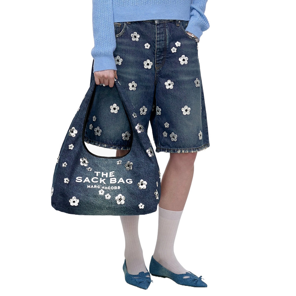 An iconic silhouette crafted in premium denim, this playfully elevated take on the signature Sack Bag exudes the quintessential Marc Jacobs spirit. Decorated with textural sequin daisies, hot fix gems at the center of each daisy and embroidered namesake branding, this essential carryall features a removable internal pouch for all your essentials and an effortless magnetic closure for uncompromised ease.