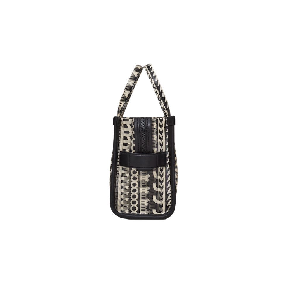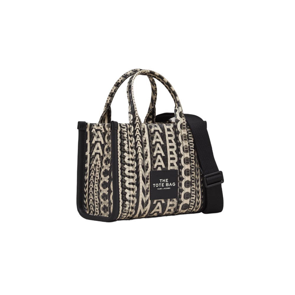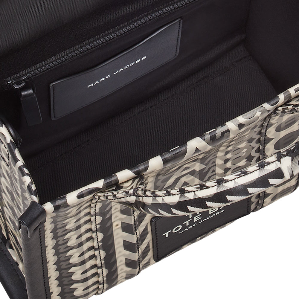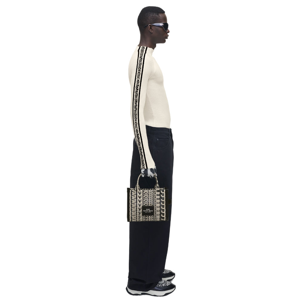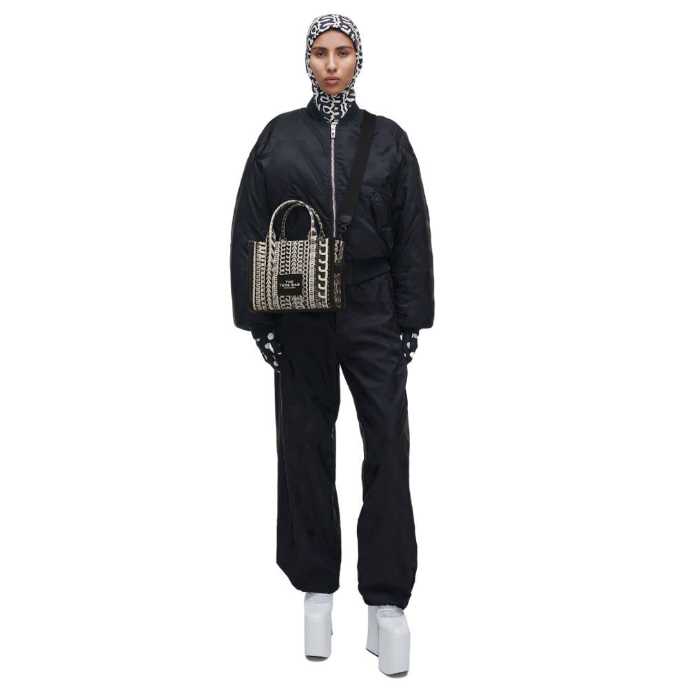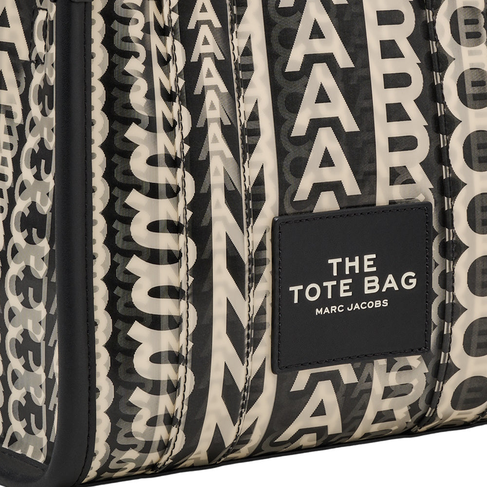 Marc Jacobs' The Tote Bag arrives in black faux leather printed with the brand's signature monogram in white. The lenticular style refers to the overlapped lettering used to create an optical illusion. We recommend juxtaposing it over a monochrome outfit.