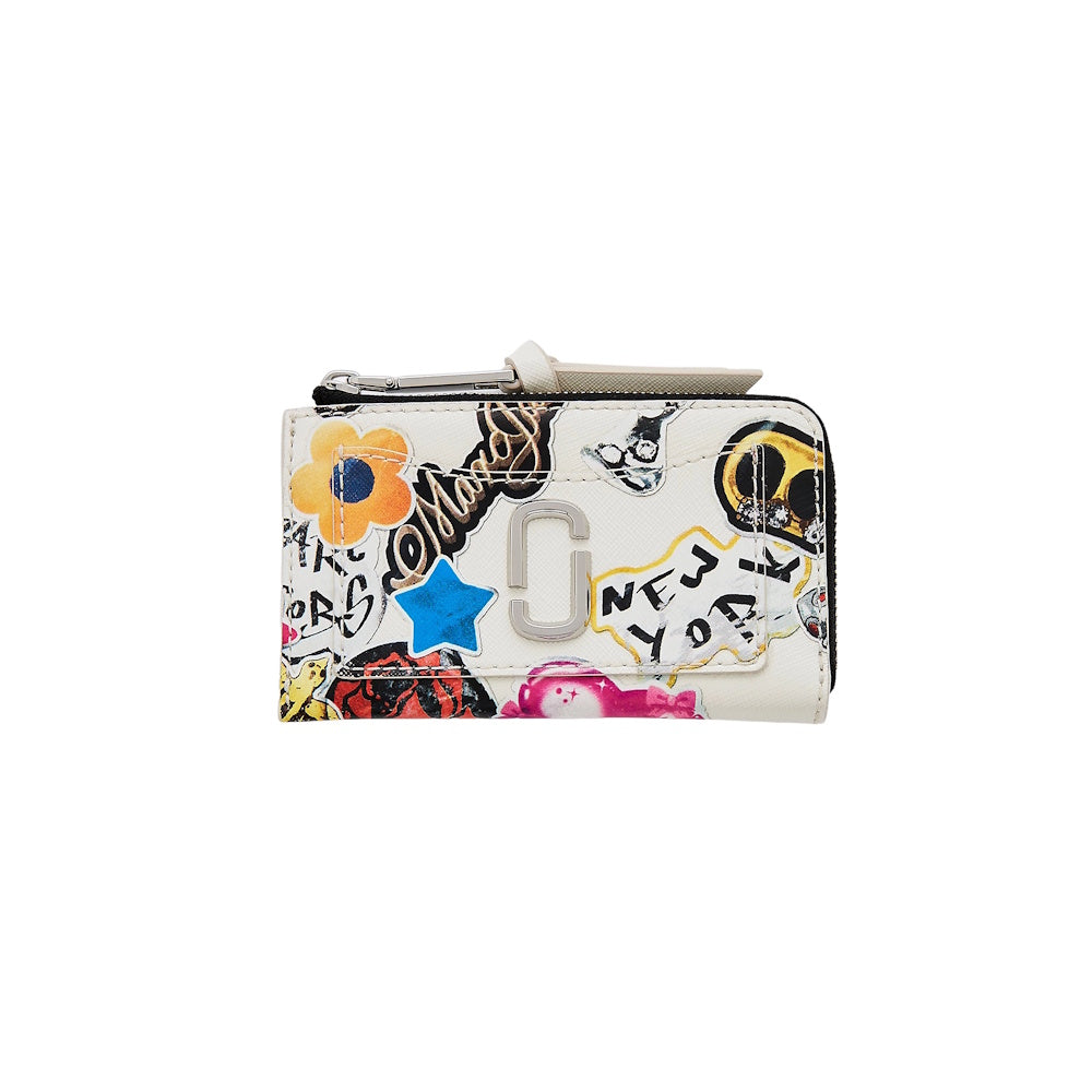 Inspired by the design DNA of our iconic Snapshot, and texturally screen printed with our seasonal sticker motif, the Utility Snapshot Top Zip Multi Wallet is luxuriously crafted in Saffiano leather for impeccable quality and durability. Featuring our signature J Marc Hardware Seal, it includes four card slots, two slip pockets, and a dog clip chain for effortless key storage.